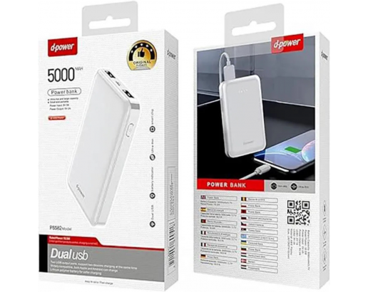 Batterie externe D-Power P8582 avec une capacité de 5000mAh, parfaite pour recharger vos appareils en déplacement.